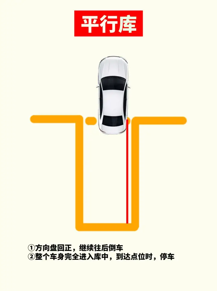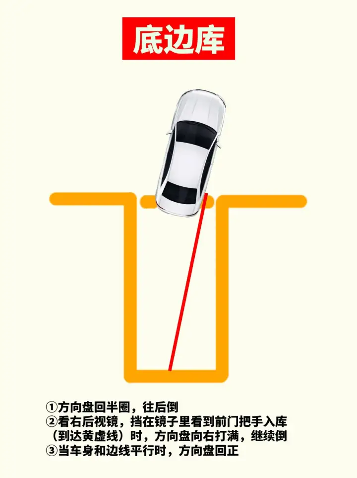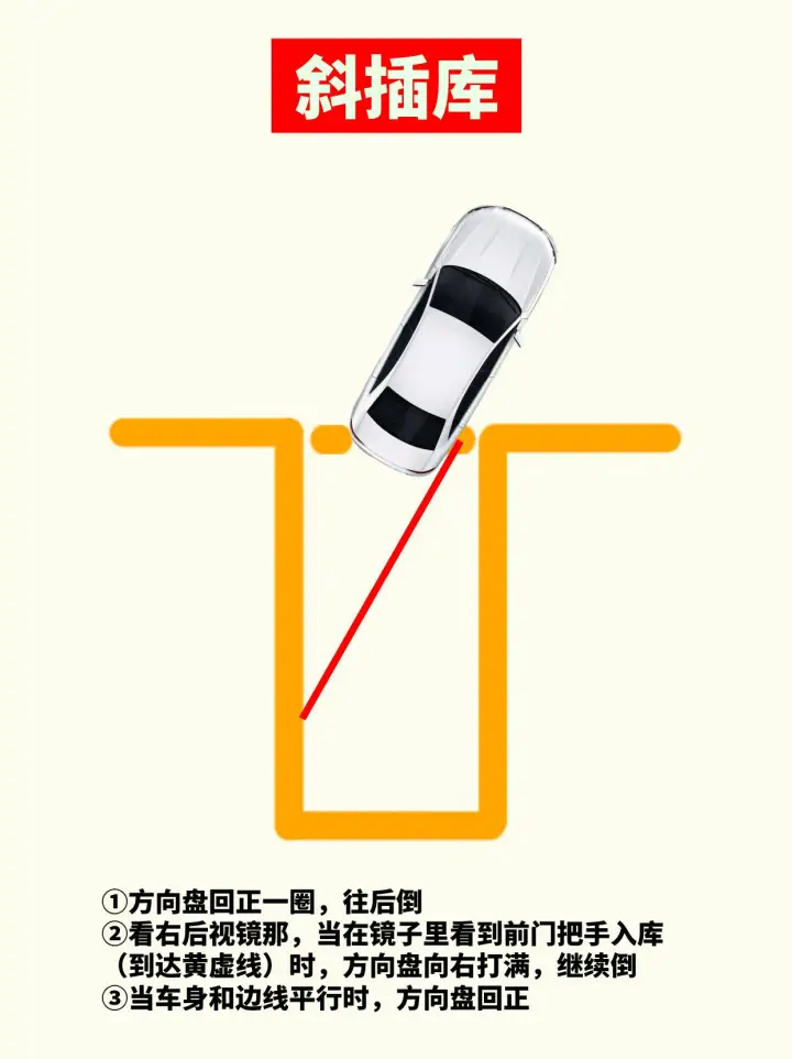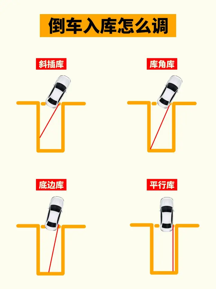 🔴斜插库:车尾正对左边线 ①方向盘回正一圈,往后倒 ②看右后视镜那,当在镜子里看到前门把手入库(到达黄虚线)时,方向盘向右打满,继续倒 ③当车身和边线平行时,方向盘回正 🔴库角库:车尾正对库角 ①方向盘回正,往后倒 ②看右后视镜,当在镜子里看到前门把手入库(到达黄虚线)时,方向盘向右打满,继续倒 ③当车身和边线平行时,方向盘回正 🔴底边库:车尾斜对库内横线 ①方向盘回半圈,往后倒 ②看右后视镜,挡在镜子里看到前门把手入库(到达黄虚线)时,方向盘向右打满,继续倒 ③当车身和边线平行时,方向盘回正 🔴平行库:车尾正对库内横线 ①方向盘回正,继续往后倒车 ②整个车身完全进入库中,到达点位时,停车 倒车入库不难,多练就行,看熟练度,平时在家的时间,可以到宝典的3D模拟上练,点位教学很详细,教练都说好,我们都在用~最后祝大家科二一切顺利,一把就过💯