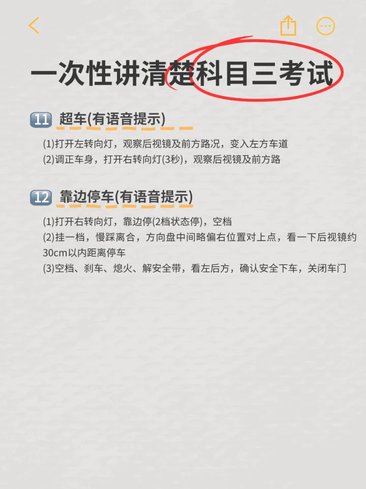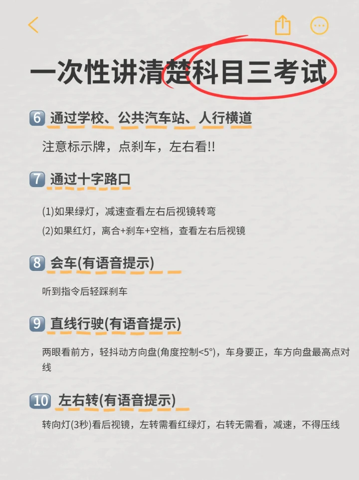 科目三有的人觉得难,有的人觉得简单,其实科三主要是考细节,不注意细节考试的时候就很容易翻车🌊 不过也不要着急,越急越容易出错,其实我觉的平时练车和考试的时候只需要做到以下几点就可以了! 第一招,要有“稳如老狗”的心态,上车先深呼吸,告诉自己:“沉着冷静,不要忘记每个点位,遇事不要慌”💪 心态放平,只要开稳了紧张感自然就没有了,心里只有下一步该怎么做! 第二招,“眼观六路耳听八方”的超能力👀👂。变道、转弯、遇到人行横道,提前打灯、看镜、摆头,踩刹车这些小动作虽然不起眼,却是科目三的重中之重,安全第一。 第三招,对于油门我们要“温柔以待”👣。加速不猛踩油门,减速不急刹。 第四招,学会预判。做到心中有线路,前方路况如何,那里需要紧急避让,要有谱。前方有情况,提前做好准备,不给考官扣分的机会。 其实每个人的学车的节奏都不同,别拿自己和别人比,专注自己的进步,练好自己的车,不懂的及时向教练请教,每个步骤都弄懂,做到心中不慌就没问题啦,科三考过驾照已经在向我们招手啦!👋