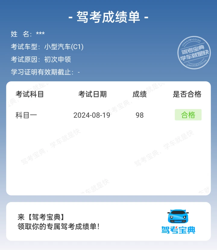 轻轻松松简简单单,感谢驾考宝典,今日前来谢宝典,祝愿大家考试都是一把过。科目四98分,十分!感谢