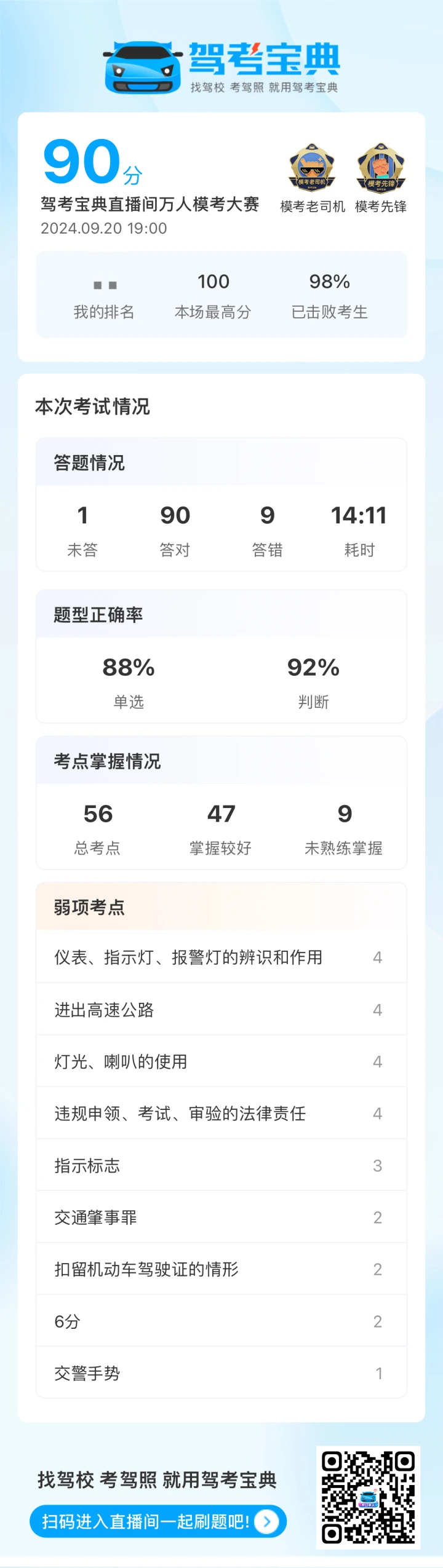 模拟考试90,科目一去考也是90,很多题目都是万人模考里面的原题,感觉自己好运爆棚啦 万人模考只有每周五晚上7点才有,想参与的宝子要蹲一下模考的直播,我还挺喜欢这种上万人一起答题的感觉,不过有些网友会在评论区敲答案,大家注意一下不要被干扰,按照自己的思路答题 答题完了之后会有老师讲重难点,这个很关键,讲的都是易错易考题,我在里面学了好多技巧,还挺不错的