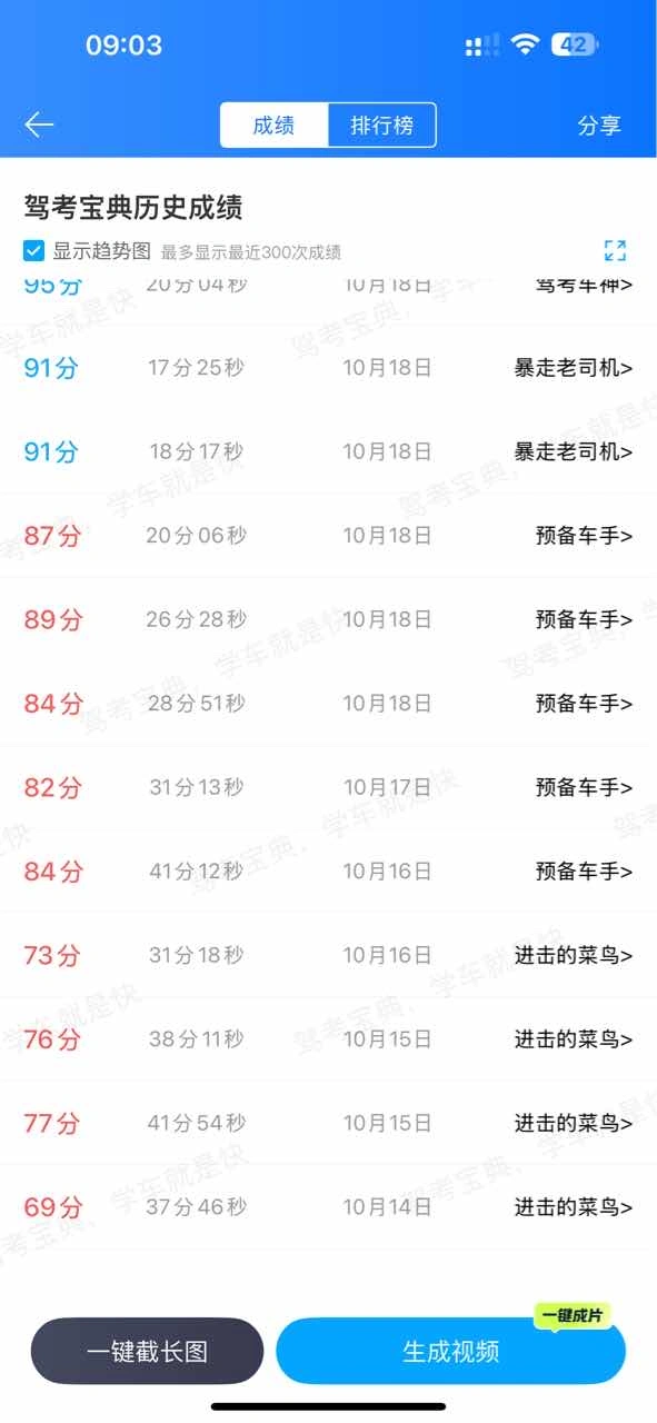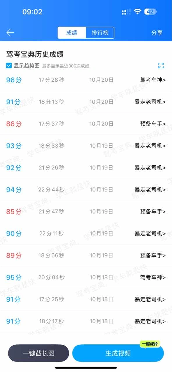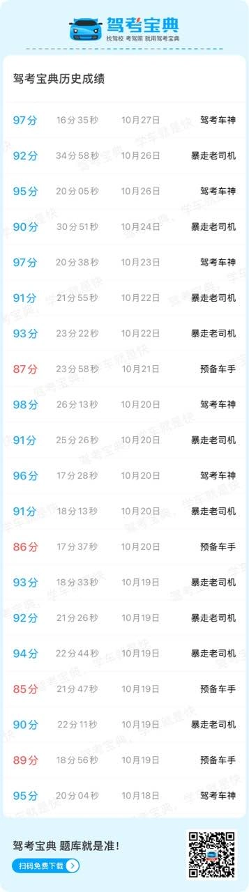 #驾考宝典 #科目一一举拿下 97过) 科目一97台过了来还愿,科一三小时精华课视频都看完了,宝典模拟题做了6套(前面一般八十几台,最后两次91台93台),就去考试了,根据肖肖老师讲的,还有自己整理的口诀如下,希望帮到大家,一起一把过 分数题: 1台:会车年检安全带,禁止标识普倒掉 3台:普逆穿插手电话,高低不低不按道,三不让(让行让人让校车) 6分:应急占道暂扣期 9台:准驾不符高速停 2公:高例掉逆和饮酒,替人罚销谋利益