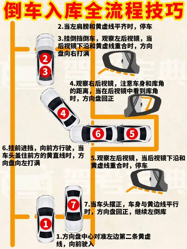 倒车入库详细技巧教程【以右倒库为例】 1.方向盘中心对准左边第二条黄虚线,向前驶入 2.当左肩膀和黄虚线平齐时,停车 3.挂倒挡倒车,观察左后视镜,当后视镜下沿和黄虚线重合时,方向盘向右打满 4.观察右后视镜,注意车身和库角的距离,当在后视镜中看到库角时,方向盘回正 5.观察左后视镜,当后视镜下沿和黄虚线重合时,停车 6.挂前进挡,向前方行驶,当车头盖住前方的黄直线时,方向盘向左打满 7.当车头摆正,车身与黄边线平行时,方向盘回正,继续左倒库 主要就是多练,大家可以到宝典的3D模拟里练习,有更详细的教学,还能模拟考试,非常方便,新手学员可以去试试哦,最后祝你们科目二顺顺利利一次过~💕