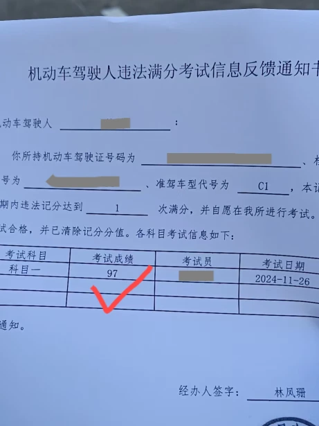 驾照扣了12分过期了,又要考一次科目一,可是好久了我都忘记了,记性也不好,学不进去。我找其他方法,找驾考宝典的老师问,他们说有一对一的帮助,帮我考过科目一。 老师很好很负责,帮我学习,模拟考试稳定在90分以上了,我去考试,97分过了。 谢谢驾考宝典,也提醒分扣完的学员,再考科目一可以找驾考宝典的老师,包过,不过不要钱。我很谢谢他们!也祝各位兄弟姐妹们成功通过考试,开车路上平安🙏🙏🙏