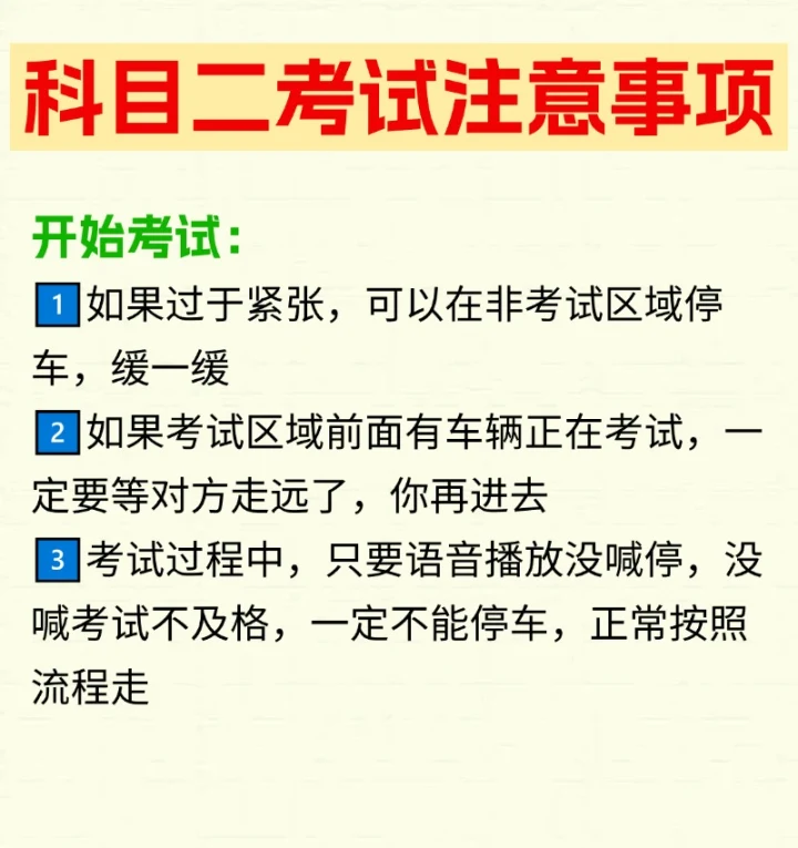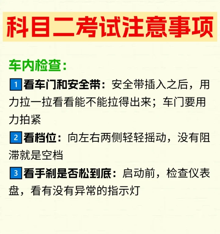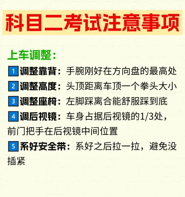 上车调整: 1️⃣调整靠背:手腕刚好在方向盘的最高处 2️⃣调整高度:头顶距离车顶一个拳头大小 3️⃣调整座椅:左脚踩离合能舒服踩到底 4️⃣调后视镜:车身占据后视镜的1/3处,前门把手在后视镜中间位置 5️⃣系好安全带:系好之后拉一拉,避免没插紧 车内检查: 1️⃣看车门和安全带:车门没关紧或者安全带没系好,扣100分 🔴考试车辆老日,识别可能不灵敏 ●安全带插入之后,用力拉一拉看看能不能拉得出来 ●车门要用力拍紧 2️⃣看档位:启动发动机时档位未在空档,扣100分 ●向左右两侧轻轻摇动,没有阻滞就是空档 3️⃣看手刹有没松到底:避免熄火,扣100分 🔴有人在车上等太久,就会忘记松手刹 ●启动前,检查仪表盘,看有没有异常的指示灯 开始考试: 准备就绪后,踩离合刹车,挂一档,松手刹 1️⃣如果过于紧张,可以在非考试区域停车,缓一缓 2️⃣如果考试区域前面有车辆正在考试,一定要等对方走远了,你再进去 3️⃣考试过程中,只要语音播放没喊停,没喊考试不及格,一定不能停车,正常按照流程走 最后我推荐给大家一个练车小工具——宝典的3D模拟,不仅可以在上面练车,熟悉点位操作,还可以在考前进行模拟考试,是不是超级方便?教练都说好,你们也试试吧~祝大家都能一把过科二,早日拿证提车🚗