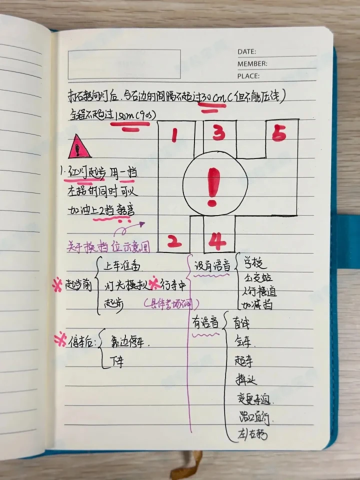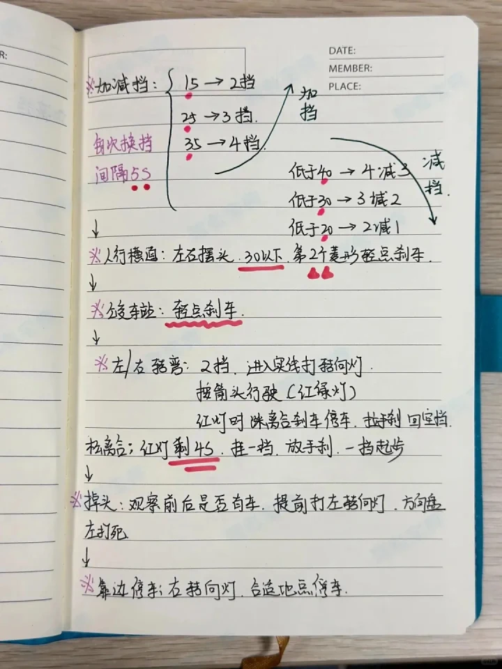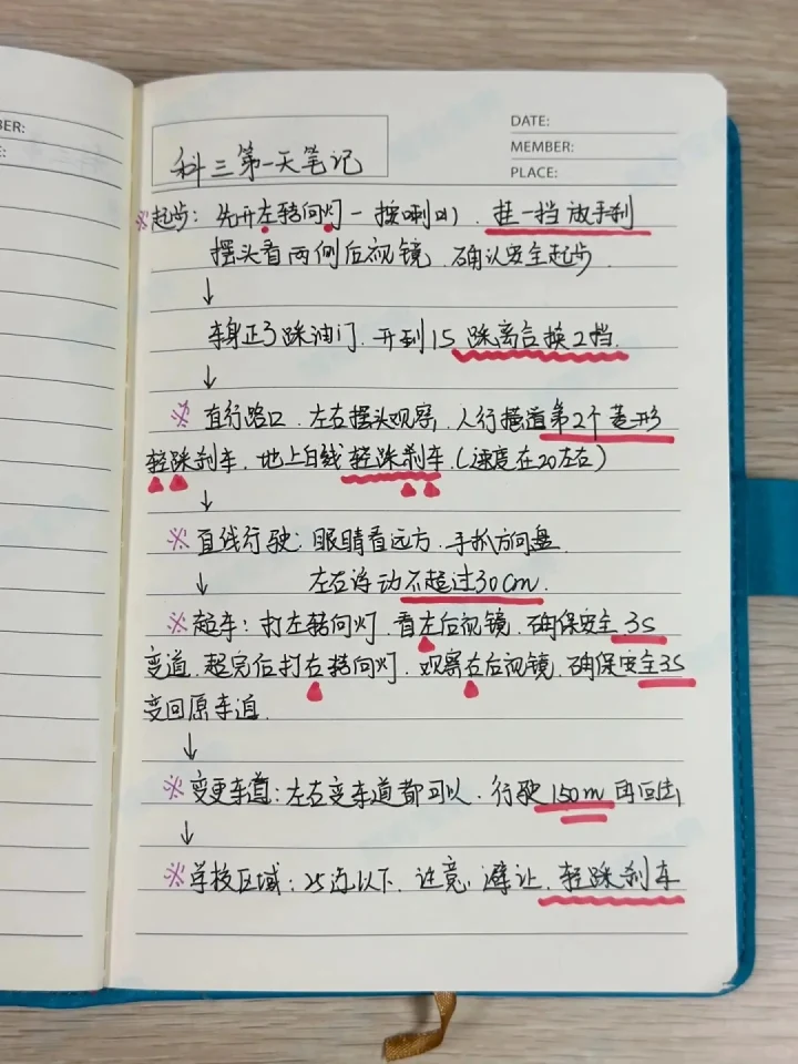 科三考试预约不容易,我约了半个月,还失败了两次。下面是我集训时记的笔记,包括考试内容和一些注意事项,希望能帮到即将考试的你们: 1. 模拟灯光后,打左灯,踩离合挂一档,松手刹出发。沿着右侧车道线行驶,第二个路口后打左灯,看左镜,向左并线。 2. 超车时,听到语音播报就打左转向灯,三秒后关掉,加点油,可以换到四档。并线时打左灯,看左镜,注意后方车辆。 3. 左转弯时,打开左灯,看左镜,听到语音播报就踩刹车,换到二档。到路口停止线再踩刹车。如果是红灯,就正常停车,减档,绿灯后一档起步。左转后换到三档,会车结束后再换到四档。 4. 会车时,听到语音播报就踩刹车,然后加油,可以换到四档。 5. 直行通过路口时,听到语音播报就踩刹车,快到路口时左右观察,过路口后加油。 6. 没有语音播报的左转弯,打左灯,轻踩刹车,换到二档,注意路况,提前判断对向来车,找好转弯时机。红灯就停车等待,左转后加油,保持二档。 7. 掉头时,听到语音播报就打左灯,踩刹车,注意对向来车,有车就停车等待。掉头后走中间车道。 8. 没有语音播报的右转弯,打右灯,看右镜,换到二档,注意路况。右转后可以换到三档,靠左侧黄虚线行驶,避免社会车辆超车。 9. 直线行驶时,听到语音播报就不要动方向盘,保持三档行驶。 10. 学校路段,没有语音播报,轻踩刹车,控制车速在30迈以下。 11. 学校路段过后的路口,车速控制在30以下。过路口后加油,可以换到四档,保持40迈以上。 12. 右转弯时,听到语音播报就打右灯,看右镜,踩刹车,换到二档,控制车速在20迈左右。 13. 公交车站,没有语音播报,轻踩刹车。刹车后加油,可以换到三档。 14. 变更车道时,听到语音播报就打左转向灯,三秒后关掉。 15. 靠边停车时,听到语音播报就打右转向灯,减速,看右镜,靠路边停车。停车后拉手刹,换空档,松离合,松刹车,开门,关门,听语音播报考试结果。靠边停车时可以换一档慢慢停,没有要求必须换到一档,三档减速停车也可以。