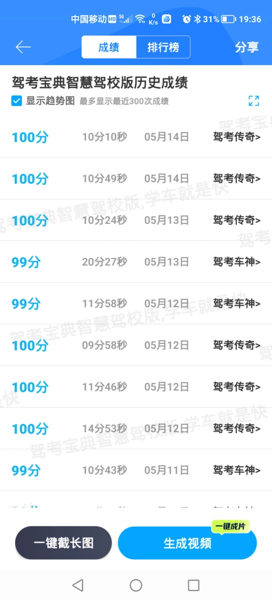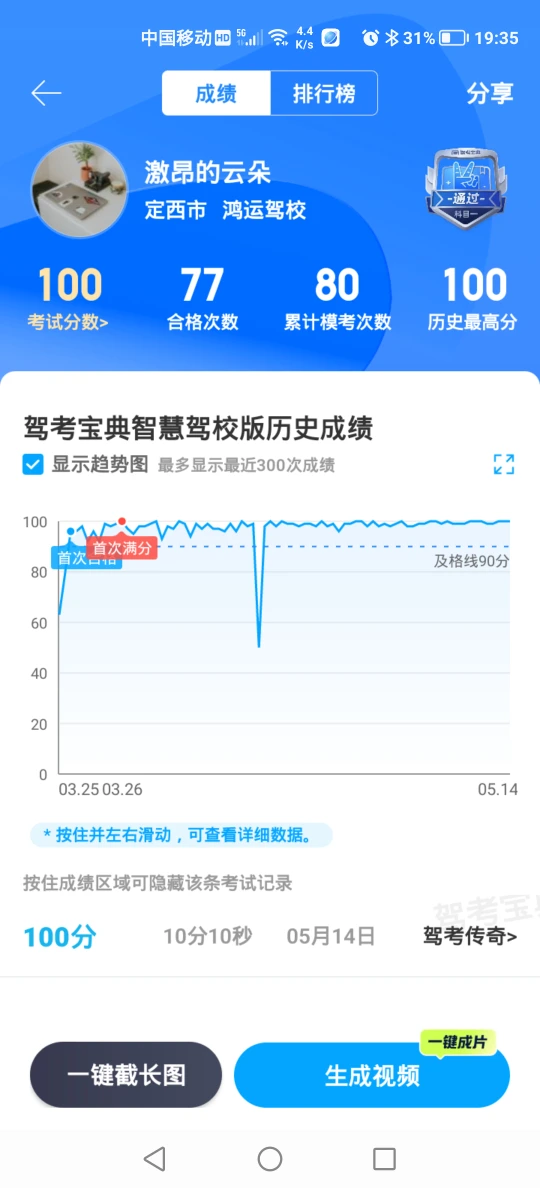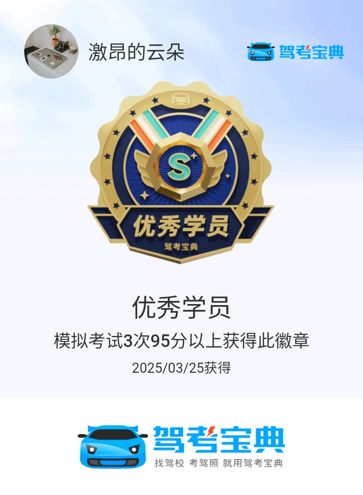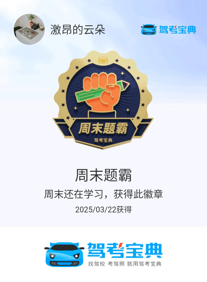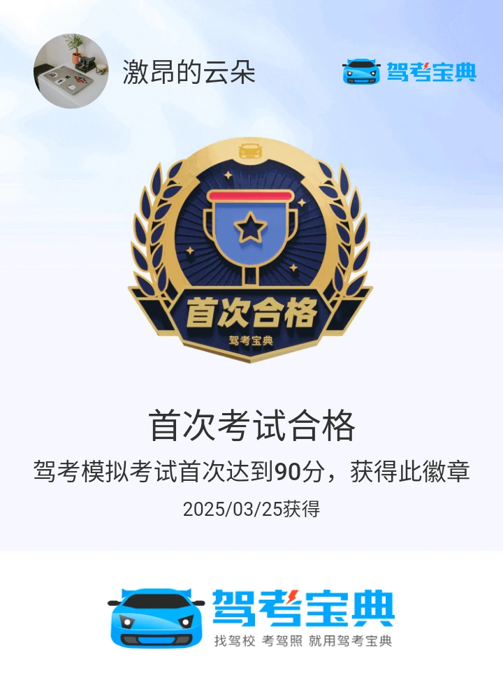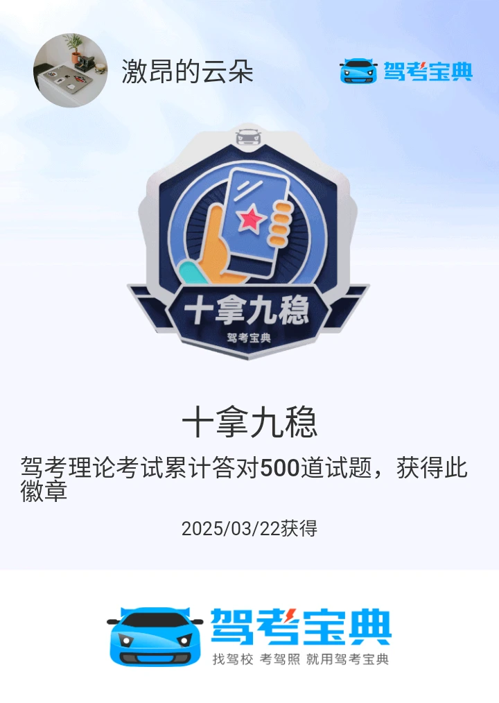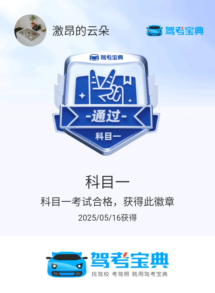 建议大家学习科一科四的时候,不急不火,认真答题,保留错题,反复作答,形成记忆,分析总结错题的原因。平均分95以上才能手拿把掐!科一约考5月16日,14分做完题目,较平时慢三分钟,考题中等难度,有两道新题。圆满完成了科一!