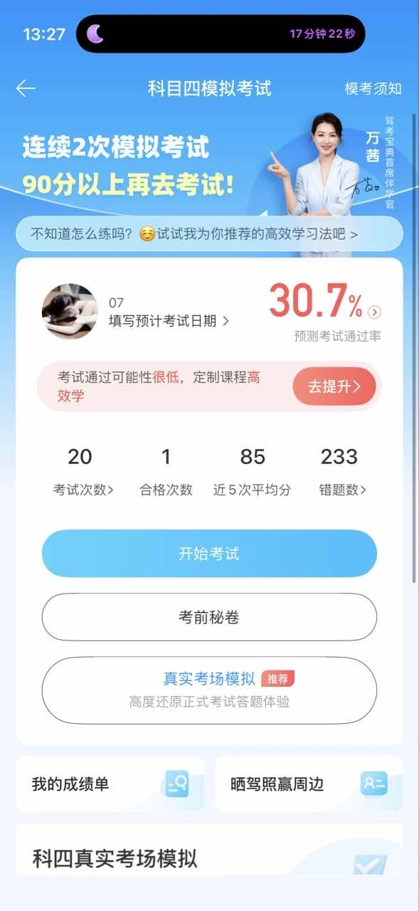 我科四就进考场前做了一遍模拟 显示我通过率百分之2.1 我一把考94