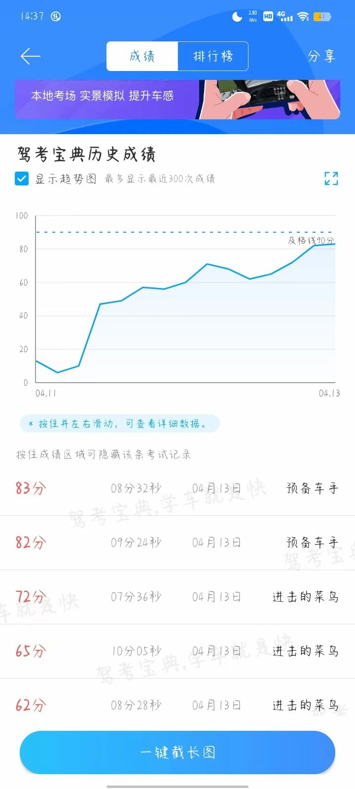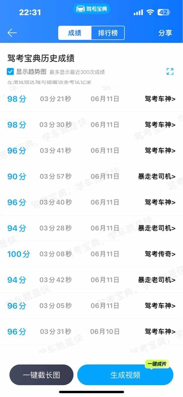 我就是开启疯模式,把驾考宝典里,科一和科四的几千道全部不漏一题刷完了,做错了再做直到对为止,我笨人笨办法,科一模拟考剧了69次直到最后全部90分以上最高刷过|个满分才去参加考试,科四刷31次26次合格里面有5至6次是满分才去考的。 科一用了20几天,科四用了3天时间 正考科一错6题,科四错1错 今天领本 脚步轻轻,功夫不负有心人。