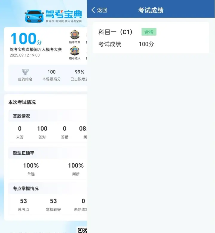 模拟100分考试也是100分,都是宝典模拟上的原题。科目一考试想要熟悉答题流程的话,参加几次万人模考就够了,还有我自己看肖肖3小时精华课总结的一些答题技巧,分享给你们!考试当天一定要带身份证,遇到不会的题后面用排除法来做,加油宝子们!