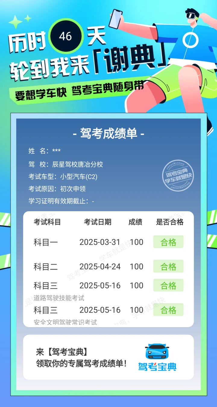 浅浅记录一下驾考成绩。科一到科四