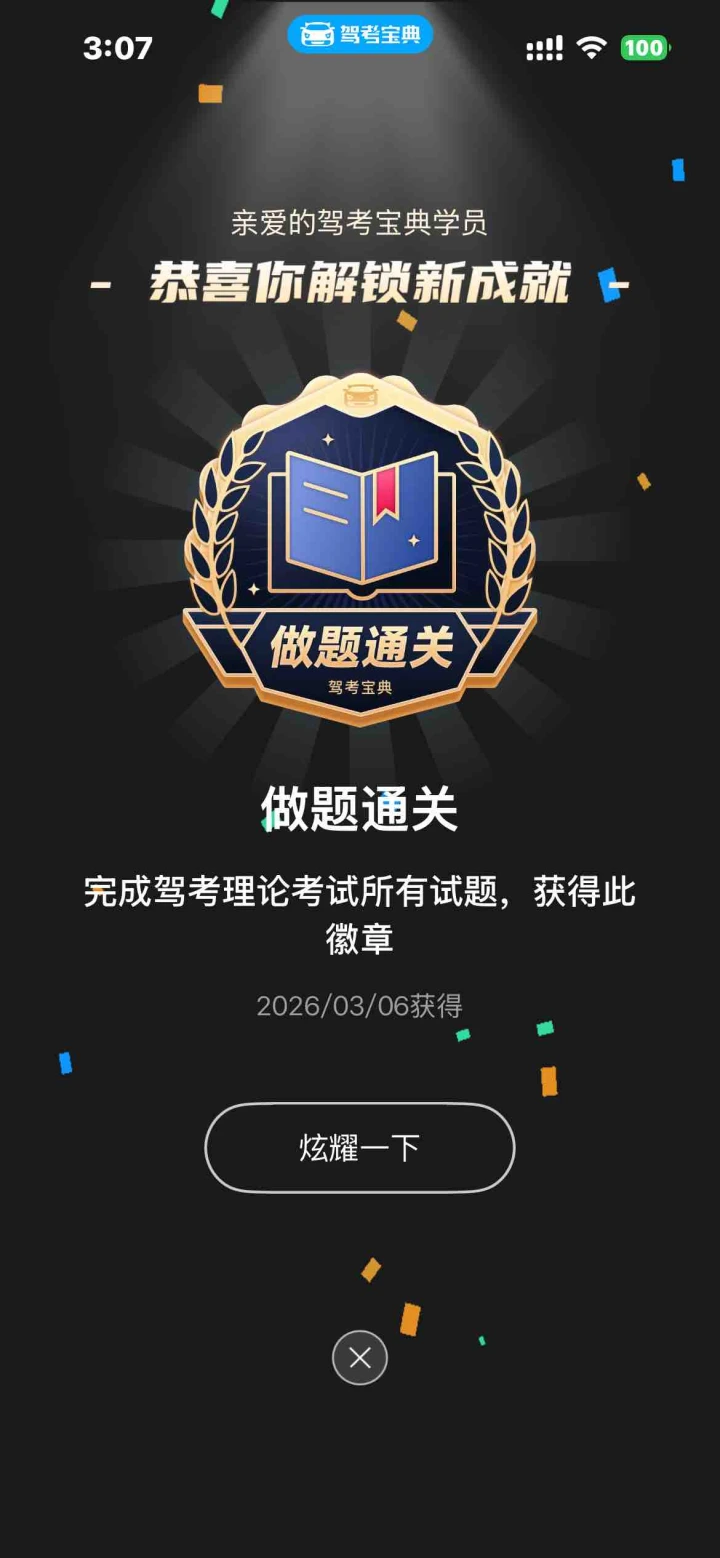 练习题虽然做完了但是错题还是很多的 😘模考成绩 晒出你的科一模考成绩 ☑️分享技巧 分享你的刷题技巧、学习笔记 💯考试许愿 说出你的考试城市,许愿科一旗开得胜