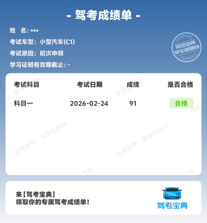 当前位置:首页>驾考圈>科目一>科一顺利通关,友友们收下这份驾