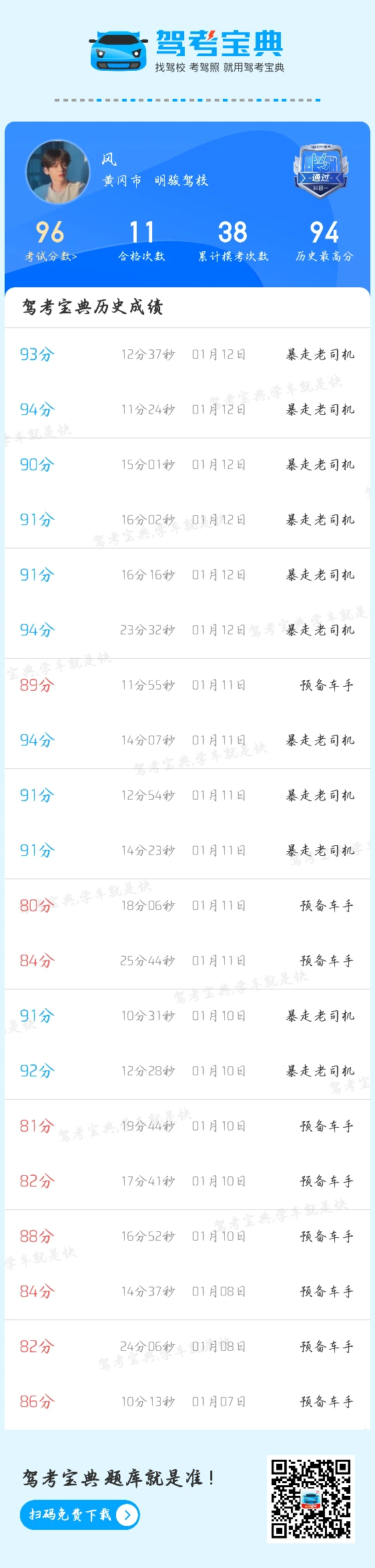 这是科目一的练习结果,明天就考科目四了。科目四还在练习中。都是一把过的