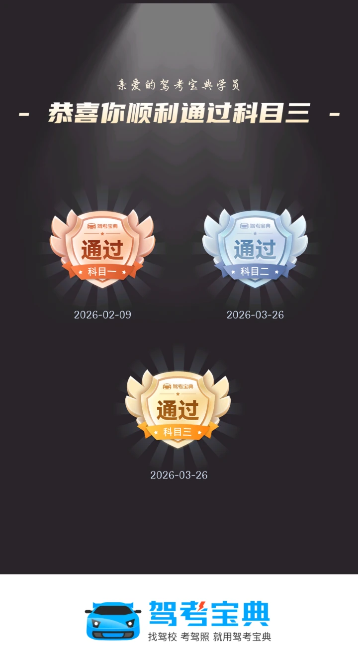 最美的声音:成绩合格,科三顺利通过啦!愿你把这次通过当作起点,未来更大的路,也能稳稳开到终点。
