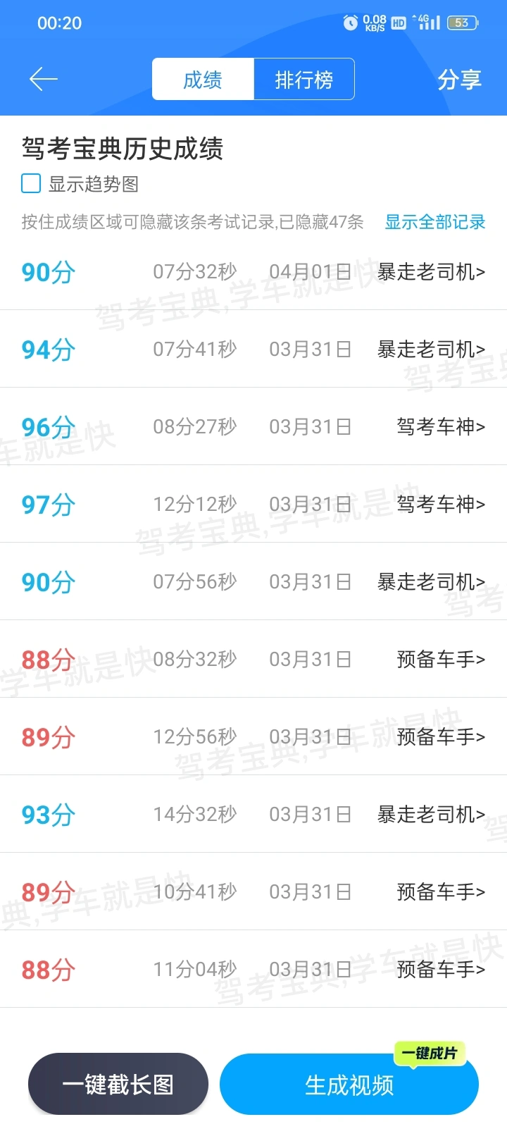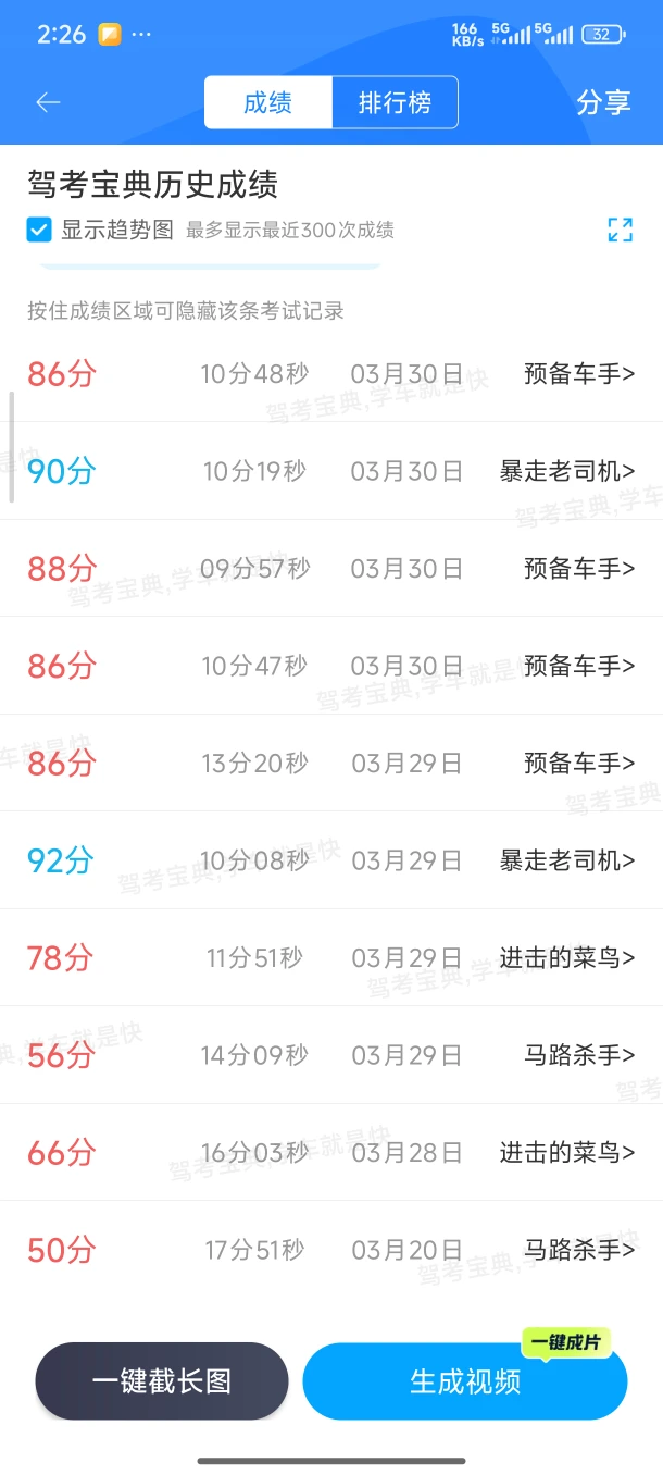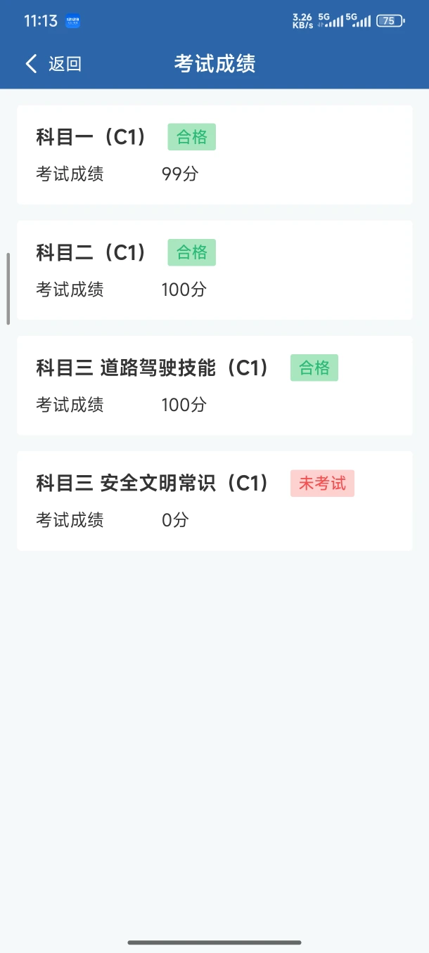 全部一遍过😃😃 科一99 科二100 科三100 科四98 考完光速拿证 1⃣️科一就正常刷题,我好像是刷了4-5天左右,把题库顺序刷题2000题几乎刷了一遍,然后又做了二十套左右模拟应该是,最后考试手滑点错了一题😂,可以考场上其实没模拟那么难,大家放宽心,我是在考场上才拿的最高分。 2⃣️科二断断续续应该是练了7天左右,考前是连续练了两天,一天大概2-3小时。科目二没那么难,注意一些细节,坡道定点别熄火,倒车入库别过线,基本都没啥问题,毕竟80就合格了。 3⃣️科三练了5天,其中考前连续练了两天,依旧是一次2小时左右,昨天模拟了一次,扣了230分😂😂熄火三次,依然不耽误我今天满分哈。所以大家也不要因为模拟的成绩不理想就担心哈,只要平时练得没问题,考场上好好发挥就行了👍👍👍 4⃣️科四没什么好说的,减配版科目一,我只是28号b站上随便找了一个科四的视频,大概半小时看了一下。昨天刷了几套题就直接上了,依旧是考场上会比模拟题简单不少,放心冲,而且我科四模拟成绩也不好,但依然高分通过了😌😌附上我科四模拟成绩图。 考前放轻松,别紧张,平时的练习一定会有回报的😉
