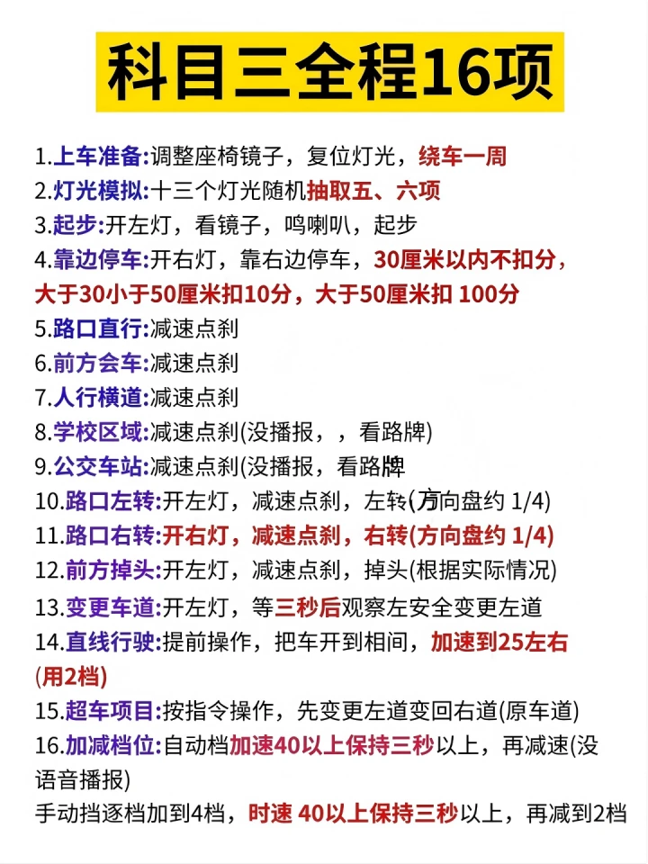 教练带着我们练了一天之后,就让我们去考,更没想到考试竟然一把就过了!!把教练发的考试技巧总结出来了,希望大家都能一把过。 练完车之后可以在手机上用3D模拟熟悉一下考试路线,考试的时候别紧张,提前观察道路情况,路上有没有行人、突然出现的车辆,有没有学校、公交站之类的,注意脚放在刹车上,到点轻踩就可以啦。 🚫这样直接扣100分: ①忘系、系错安全带 ②没有明显观察动作 ③忘打、打错灯光 ④直线行驶偏离车道 ⑤熄火后带档点火 ⑥压实线 ⑦不及时减速让行 ⑧靠边停车超50cm 科三整体操作难度比科二低,重点在于稳,祝大家好运。