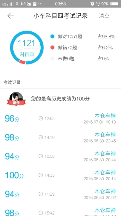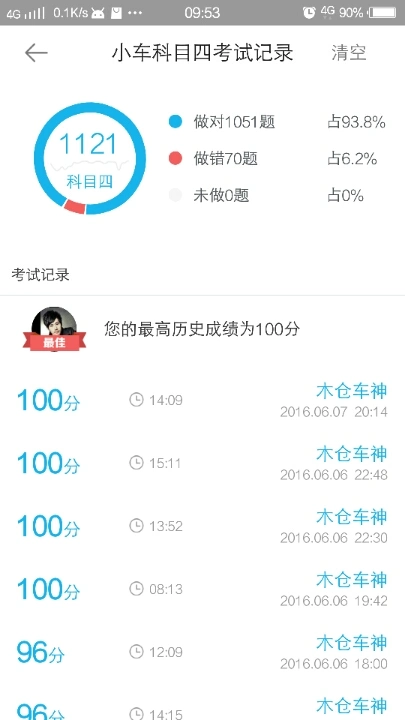 昨天白天钓一天的鱼,都没怎么练,今天发挥非常好,科目四考100,下周一去领证,前身轻松一节……