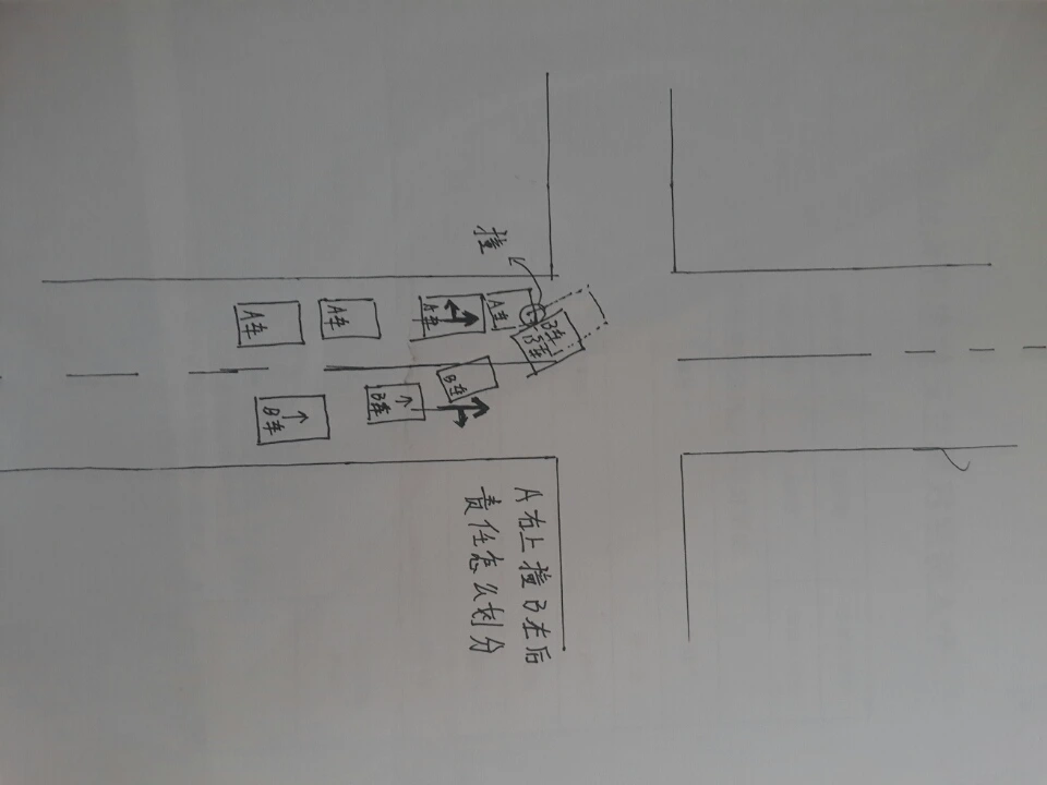如图,大概就这么个情况,撞得挺严重,在省道上~前车B确定实线变道,位置可能会有偏差。交警责任认定还没下来,想提前问问。撞车点在虚线位置,因为当时向左躲了一下。右面也有车,急刹,所以右面没有躲避空间。