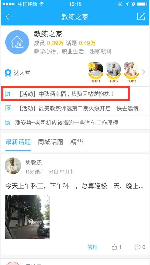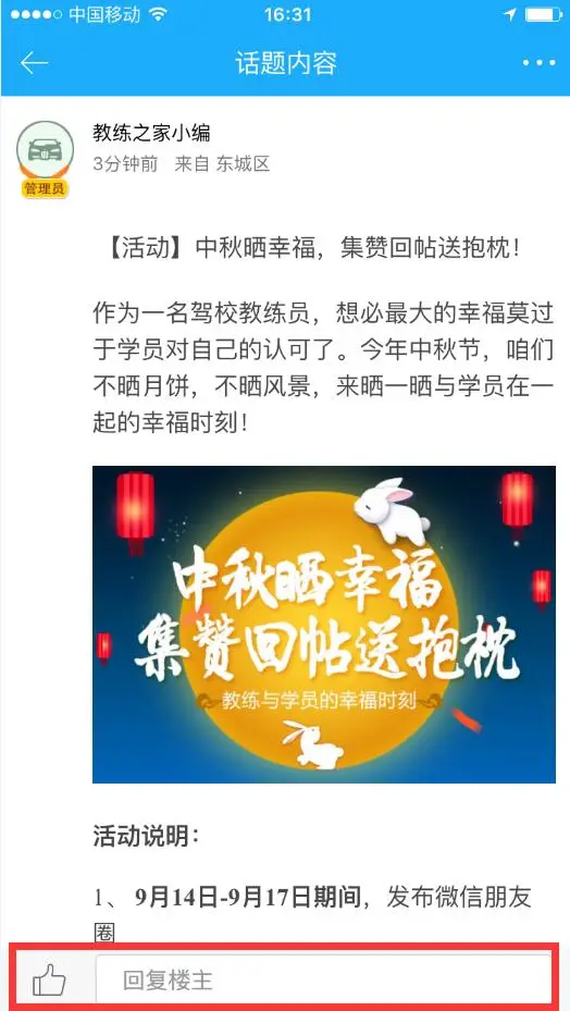 3、 到教练宝典app的【教练之家】版块,回复置顶主题帖“中秋晒幸福,集赞回帖送抱枕”并附上朋友圈截图;
