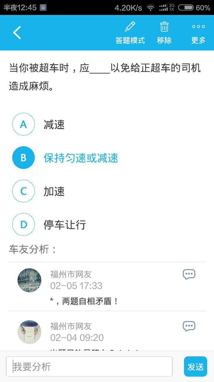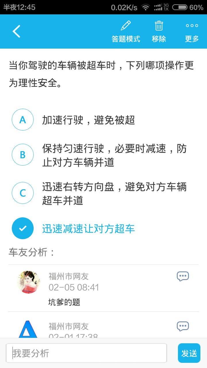 补充:它给得正确答案1b,2d.第一张图毫无疑问是b;第二张图b答案正如14楼所说,防止并道,就是不给对方超车,但d答案迅速减速我觉得不合理,相对其他答案更为理性也只有d了。此题容易被坑,大家注意!!!(科四,福州地区题)